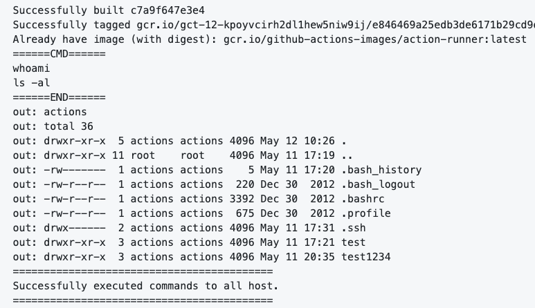 # 🚀 SSH for GitHub Actions [GitHub Action](https://developer.github.com/actions/) for executing remote ssh commands. ## Usage Executing remote ssh commands. ``` action "Executing remote ssh commands" { uses = "appleboy/ssh-action@master" secrets = [ "HOST", "PASSWORD", ] args = [ "--user", "actions", "--script", "whoami", ] } ``` ## Environment variables * HOST - ssh server host * PORT - ssh server port * USERNAME - ssh server username * PASSWORD - ssh server password * KEY - ssh server private key * SCRIPT - execute the scripts ### Example Executing remote ssh commands. ``` action "Executing remote ssh commands" { uses = "appleboy/ssh-action@master" secrets = [ "PASSWORD", ] args = [ "--host", "foo.com" "--user", "bar", "--script", "whoami", ] } ``` Using private key ``` action "Support Private Key" { uses = "appleboy/ssh-action@master" secrets = [ "HOST", "KEY", ] args = [ "--user", "actions", "--script", "'ls -al'", ] } ``` Multiple Commands ``` action "Multiple Commands" { uses = "appleboy/ssh-action@master" secrets = [ "HOST", "KEY", ] args = [ "--user", "actions", "--script", "'whoami'", "--script", "'ls -al'", ] } ``` Multiple Hosts ``` action "Multiple Hosts" { uses = "appleboy/ssh-action@master" secrets = [ "KEY", ] args = [ "--host", "foo.com", "--host", "bar.com", "--user", "actions", "--script", "'whoami'", "--script", "'ls -al'", "--script", "'cat test.txt'", ] } ``` see the detail of `drone-ssh` command ``` --ssh-key value private ssh key [$PLUGIN_SSH_KEY, $PLUGIN_KEY, $SSH_KEY, $KEY] --key-path value, -i value ssh private key path [$PLUGIN_KEY_PATH, $SSH_KEY_PATH, $PATH] --username value, --user value, -u value connect as user (default: "root") [$PLUGIN_USERNAME, $PLUGIN_USER, $SSH_USERNAME, $USERNAME] --password value, -P value user password [$PLUGIN_PASSWORD, $SSH_PASSWORD, $PASSWORD] --host value, -H value connect to host [$PLUGIN_HOST, $SSH_HOST, $HOST] --port value, -p value connect to port (default: 22) [$PLUGIN_PORT, $SSH_PORT, $PORT] --sync sync mode [$PLUGIN_SYNC, $SYNC] --timeout value, -t value connection timeout (default: 0s) [$PLUGIN_TIMEOUT, $SSH_TIMEOUT, $TIMEOUT] --command.timeout value, -T value command timeout (default: 1m0s) [$PLUGIN_COMMAND_TIMEOUT, $SSH_COMMAND_TIMEOUT, $COMMAND_TIMEOUT] --script value, -s value execute commands [$PLUGIN_SCRIPT, $SSH_SCRIPT, $SCRIPT] --script.stop stop script after first failure [$PLUGIN_SCRIPT_STOP, $STOP] --proxy.ssh-key value private ssh key of proxy [$PLUGIN_PROXY_SSH_KEY, $PLUGIN_PROXY_KEY, $PROXY_SSH_KEY] --proxy.key-path value ssh private key path of proxy [$PLUGIN_PROXY_KEY_PATH, $PROXY_SSH_KEY_PATH] --proxy.username value connect as user of proxy (default: "root") [$PLUGIN_PROXY_USERNAME, $PLUGIN_PROXY_USER, $PROXY_SSH_USERNAME] --proxy.password value user password of proxy [$PLUGIN_PROXY_PASSWORD, $PROXY_SSH_PASSWORD] --proxy.host value connect to host of proxy [$PLUGIN_PROXY_HOST, $PROXY_SSH_HOST] --proxy.port value connect to port of proxy (default: "22") [$PLUGIN_PROXY_PORT, $PROXY_SSH_PORT] --proxy.timeout value proxy connection timeout (default: 0s) [$PLUGIN_PROXY_TIMEOUT, $PROXY_SSH_TIMEOUT] ``` ## Secrets * `PASSWORD` - ssh server password * `KEY` - ssh server private key